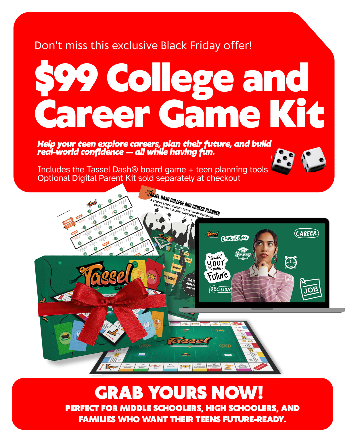 Tassel Dash® prepares teens for every pathway after graduation — CTE, college, careers, and the military. It's more than a game; it's the conversation starter that brings clarity to your family's biggest decisions and builds the confidence your teen needs to step boldly into their future.